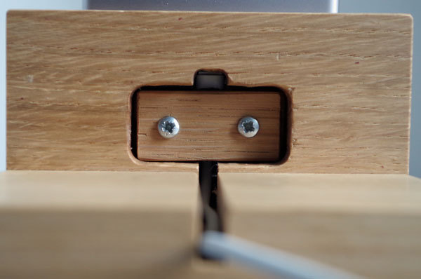 Auch hier wird Eiche verwendet und die Oberfläche mit Hartwachsöl behandelt. Zum Entfernen der Abdeckung des Kabels benötigen Sie lediglich einen Kreuzschraubendreher. Unter der Abdeckung befindet sich eine Gummierung, die das Verrutschen des Kabels verhindert.